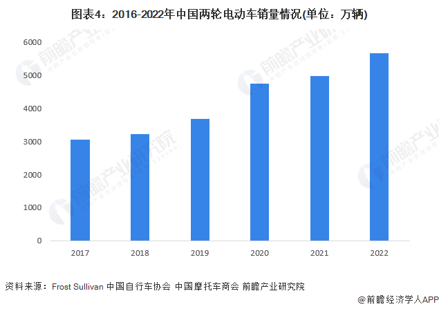 中国两轮电动车行业自2013年至2019年已处于成熟阶段多年,其特点是增长较慢而市场集中度较高,餐饮外卖、电商及按需配送以及智能技术初步兴起。尽管如此,由于2019年新国标的通过推动淘汰不合格车辆并刺激巨大的替换需求,并标志着更新及转换阶段开始,中国电动两轮车的总销量由2017年的30.5百万辆增长至2021年的49.8百万辆,复合年增长率为13.0%。据中国自行车协会和中国摩托车商会统计数据,前瞻初步统计,2022年中国两轮电动车销量约为5670万辆,再创新高。