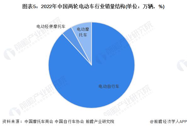 从2022年中国两轮电动车销量情况来看,电动自行车是我国两轮电动车最大的细分市场,据中国自行车协会初步统计,2022年我国电动自行车销量约为5000万辆,约占两轮电动车市场的88%;其次为电动摩托车,2022年销量约为442万辆,市场占比为8%。