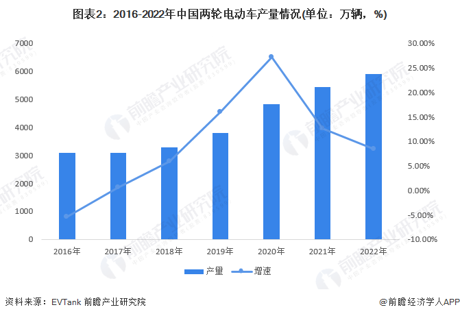 2021年,中国电动两轮车总体产量达到5443万辆,同比增长12.6%,增长幅度较2020年出现较大幅度的下滑。其中电动摩托车产量为251万辆,同比增长21.3%,电动轻便摩托车产量为64万辆,同比下滑41.6%。2022年,中国电动两轮车总体产量达到5904万辆,同比增速仅为8.5%,增长幅度连续两年呈现下滑趋势。主要系我国共享电动两轮车的投放遭遇政策阻力开始收紧,美团和滴滴等运营商放缓甚至停止投放共享电动车;同时国内部分地区推行新国标政策缓慢,大部分城市均推迟1-2年执行,导致非国标车的替换放缓。