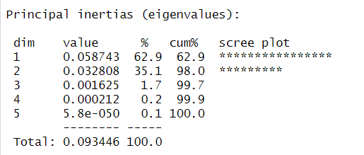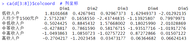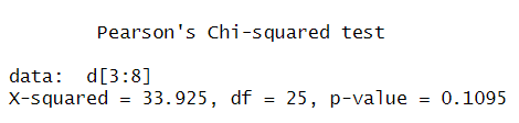 X² = 33.925,查表可知,在5%显著性下,自由度(列-1*行-1)为25的临界值是37.65,接受因素之间独立的原假设(电脑通常计算的是在原假设为真的情况),后面的p值>0.05,接受原假设,两个标准说一个就行,该数据不适合做对应分析。