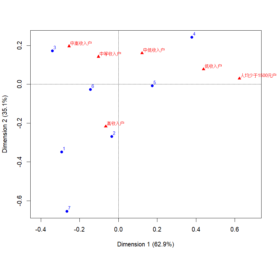 两个因子的累计贡献率达到了98.0%,我们选取两因子做对应分析图。