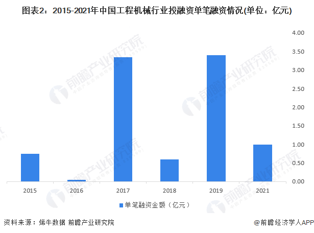 从中国工程机械行业投融资事件已披露的单笔最高融资金额来看,2017和2019年单笔融资金额超过1亿元,其余时间中国工程机械行业单笔融资金额均未超过1亿元。