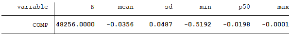 需要指出的是,用季度数据计算仅能得到公司i和公司j之间的可比性值,而公式(8)能得到公司i和同行业内其他所有公司之间的可比性值(也称为公司i的公司层面可比性值),因为公式(7)是采用同行业内其他公司的平均会计转换函数来计算预期盈余。