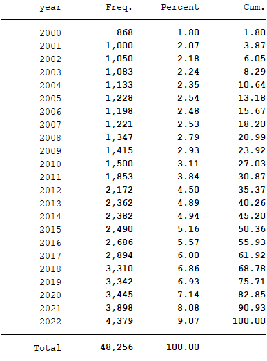 样本选择:全部A股2000-2022年数据(初始数据是从1990年开始,选取数据处理的起点为2000年,可自行更改数据计算区间)