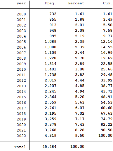 样本选择:全部A股2000-2022年数据(“审计师是否来自国际四大”数据是从2000年开始,所以数据起点选择为2000年)