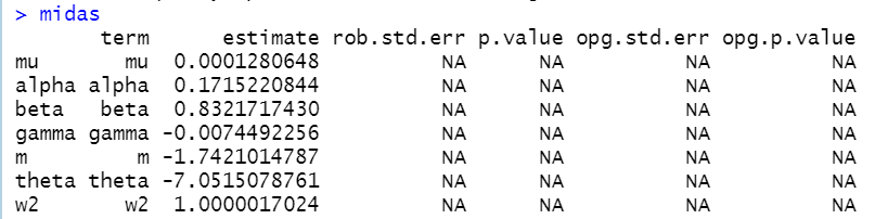 3. **优化过程失败**:fit_mfgarch()内部使用最大似然估计(MLE)来找到最优的模型参数。如果优化算法没有收敛或者遇到了局部最优解,那么rob.std.err和p.value就不能可靠地计算出来。