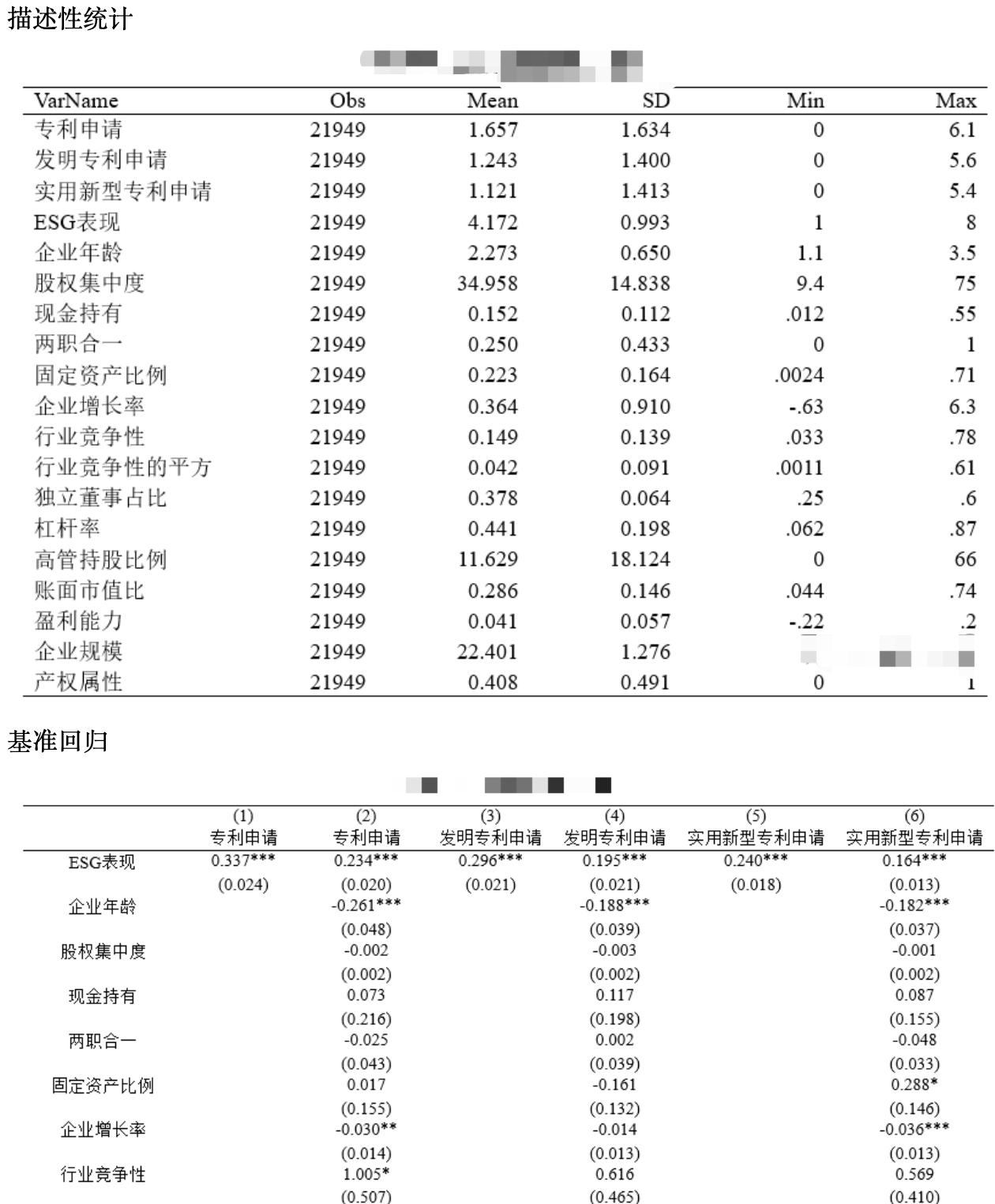 数据说明:华证ESG得分,将上市公司ESG等级从低到高分别赋值为1-9;上市公司专利数据来自国家知识产权局;控制变量主要来自上市公司年报