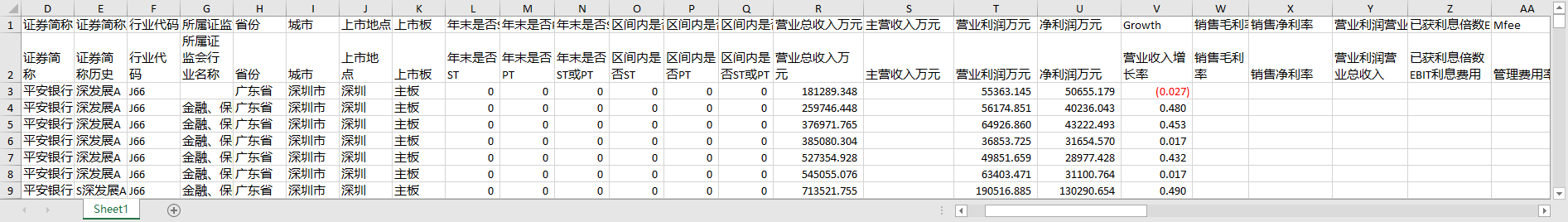stkcd year 证券代码 证券简称 证券简称历史 行业代码 所属证监会行业名称 省份 城市 上市地点 上市板 年末是否ST 年末是否PT 年末是否ST或PT 区间内是否ST 区间内是否PT 区间内是否ST或PT 营业总收入万元 主营收入万元 营业利润万元 净利润万元 营业收入增长率 销售毛利率 销售净利率 营业利润/营业总收入 已获利息倍数EBIT利息费用 管理费用率