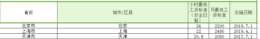 指标包括:省份 、城市/区县、 小时最低工资标准(非全日制)、 月最低工资标准 、实施日期。