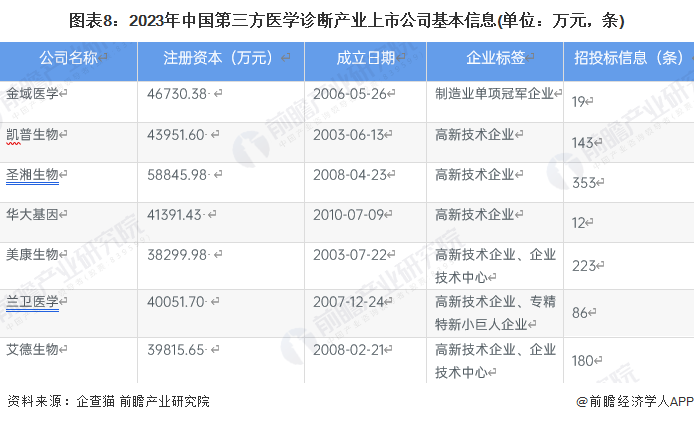 从第三方医学诊断行业的上市企业布局和已有公开信息分析,注册资本最多及成立时间最早的是凯普生物,招投标信息最多的是圣湘生物。