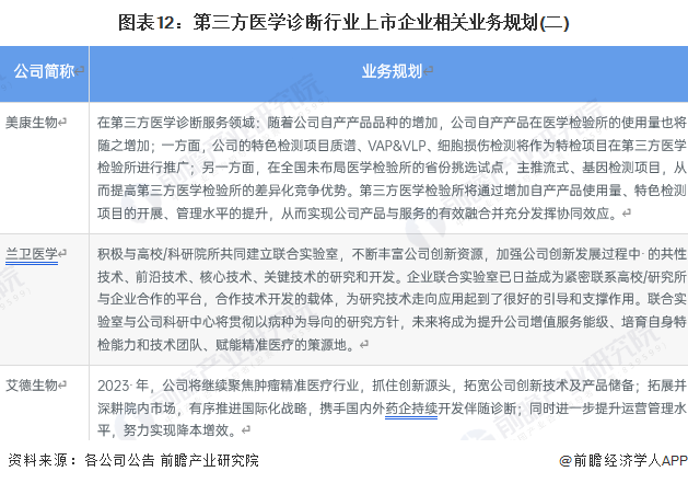 在下游医疗等行业不断发展壮大的背景下,我国近年来颁布多项政策推进第三方医学诊断行业的发展。我国第三方医学诊断主要上市企业业务规划如下: