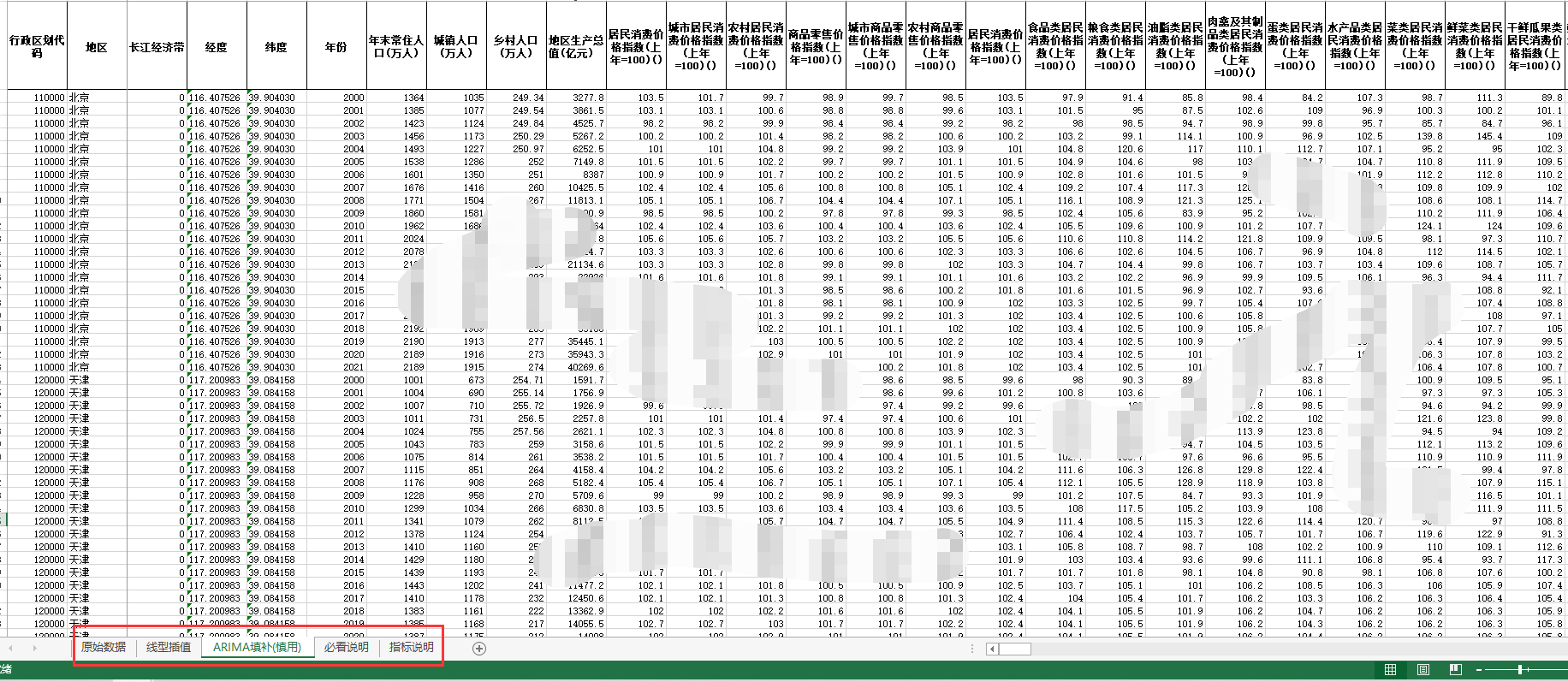 中国省级面板统计数据库-价格指数及人民生活(包含四个页签:原始数据、线性插值、ARIMA填补、指标说明四个页签)