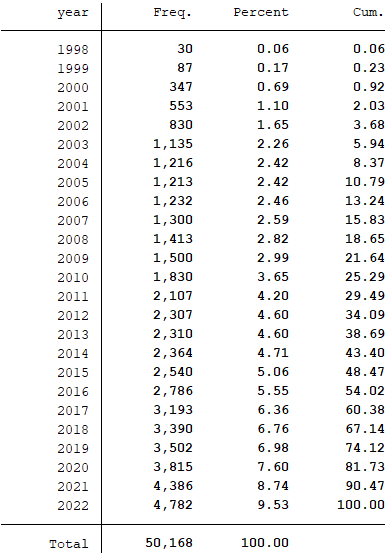 与参考文献相同,剔除金融和保险性公司,ST和PT公司样本;剔除研究期间内相关数据缺失的公司注:提供了剔除所需数据和剔除代码,若无需做该项剔除处理,自行删除相关代码重新运行即可