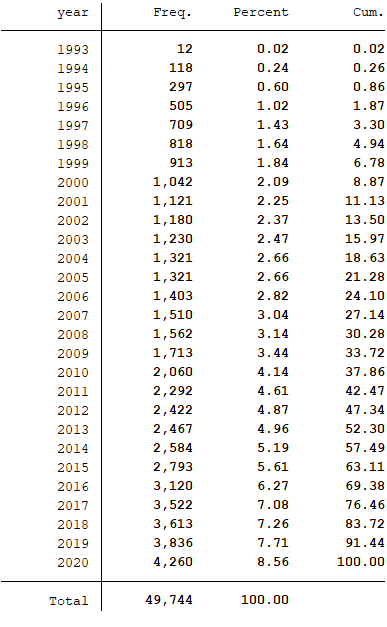 样本选择:全部A股1993-2020年数据(初始数据区间是1990-2022年,经过处理之后的数据区间为1993-2022年)