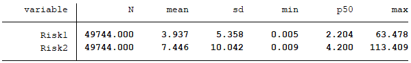 同时参考Faccio et al.(2011)和宋建波等(2017)的处理方式,将该结果乘以100得到Risk1和Risk2两个指标以衡量企业风险承担水平;对于量纲的处理能够使结果更加直观,并不影响其显著性水平。