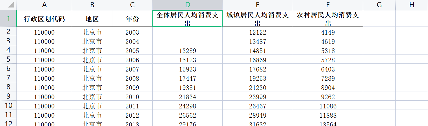 指标包括:行政区划代码 地区 年份 全体居民人均消费支出、城镇居民人均消费支出、农村居民人均消费支出