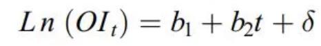[t,t+4]内建立时间变量(t)与海外销售收人(OI)自然对数之间关系的线性回归模型,如以下公式所示。最终,以公式中回归系数b,的反自然对数衡量企业的国际化速度,该值越大,表明企业的国际化扩张速度越快。