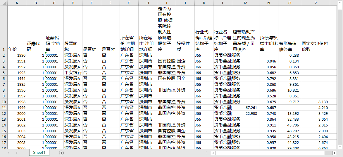年份 证券代码 证券代码-字符串 股票简称 是否ST 是否PT 所在省份-注册地详细 所在城市-注册地详细 是否为国有控股-依据实际控制人性质筛选-股东子库 股权性质 行业代码C-治理结构子库 行业名称C-治理结构子库 经营活动产生的现金流量净额/带息债务 负债与权益市价比率 有形净值债务率 固定支出偿付倍数