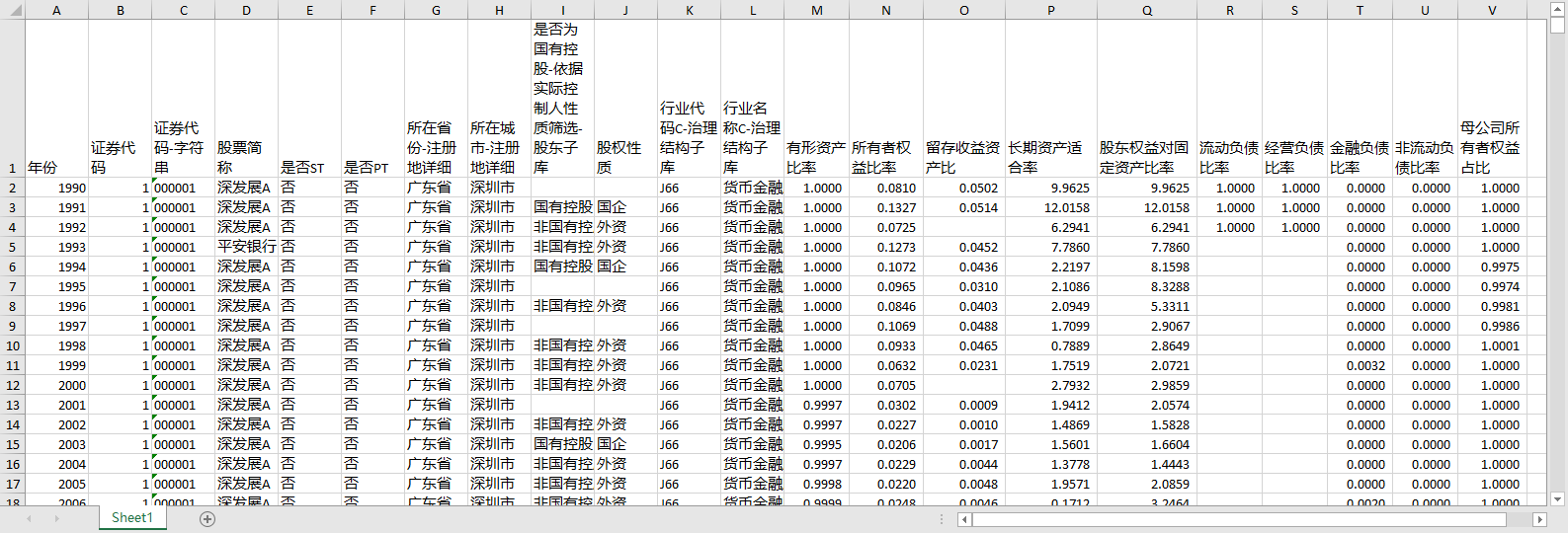 年份 证券代码 证券代码-字符串 股票简称 是否ST 是否PT 所在省份-注册地详细 所在城市-注册地详细 是否为国有控股-依据实际控制人性质筛选-股东子库 股权性质 行业代码C-治理结构子库 行业名称C-治理结构子库 流动负债比率 经营负债比率 金融负债比率 非流动负债比率 母公司所有者权益占比
