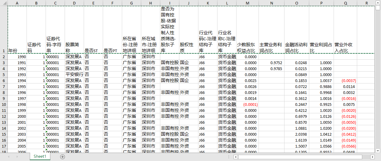 年份 证券代码 证券代码-字符串 股票简称 是否ST 是否PT 所在省份-注册地详细 所在城市-注册地详细 是否为国有控股-依据实际控制人性质筛选-股东子库 股权性质 行业代码C-治理结构子库 行业名称C-治理结构子库 少数股东权益占比 主营业务利润占比 金融活动利润占比 营业利润占比 营业外收入占比