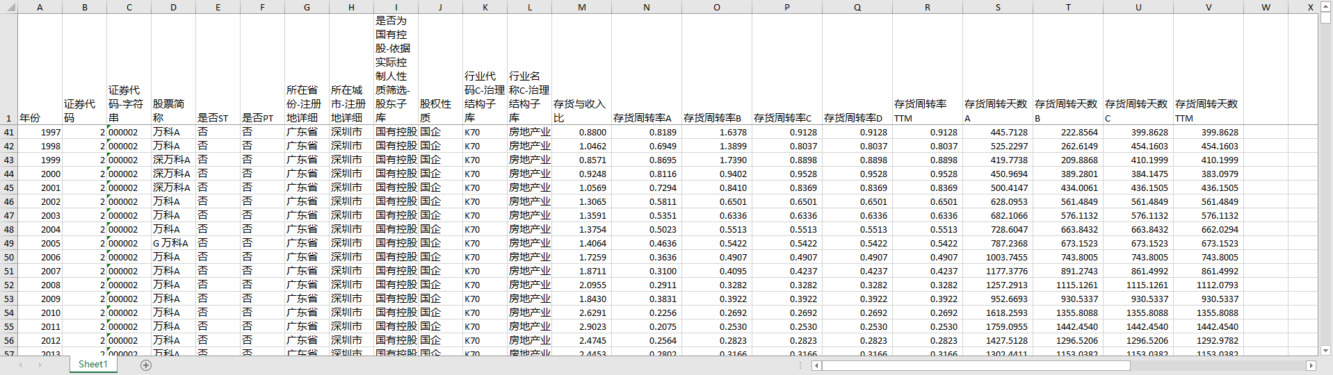 上市公司1990-2022存货与收入比存货周转率存货周转天数国有控股STPT省份城市行业名称