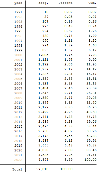 样本选择:全部A股1991-2021年数据(“周个股回报率文件”和“综合周市场回报率文件”在数据库中均是从1990-51开始,经过处理之后的数据起点为1991年)