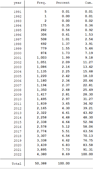 样本选择:全部A股1991-2022年数据(初始数据的起点为1990年,经过处理之后的数据起点为1991年)