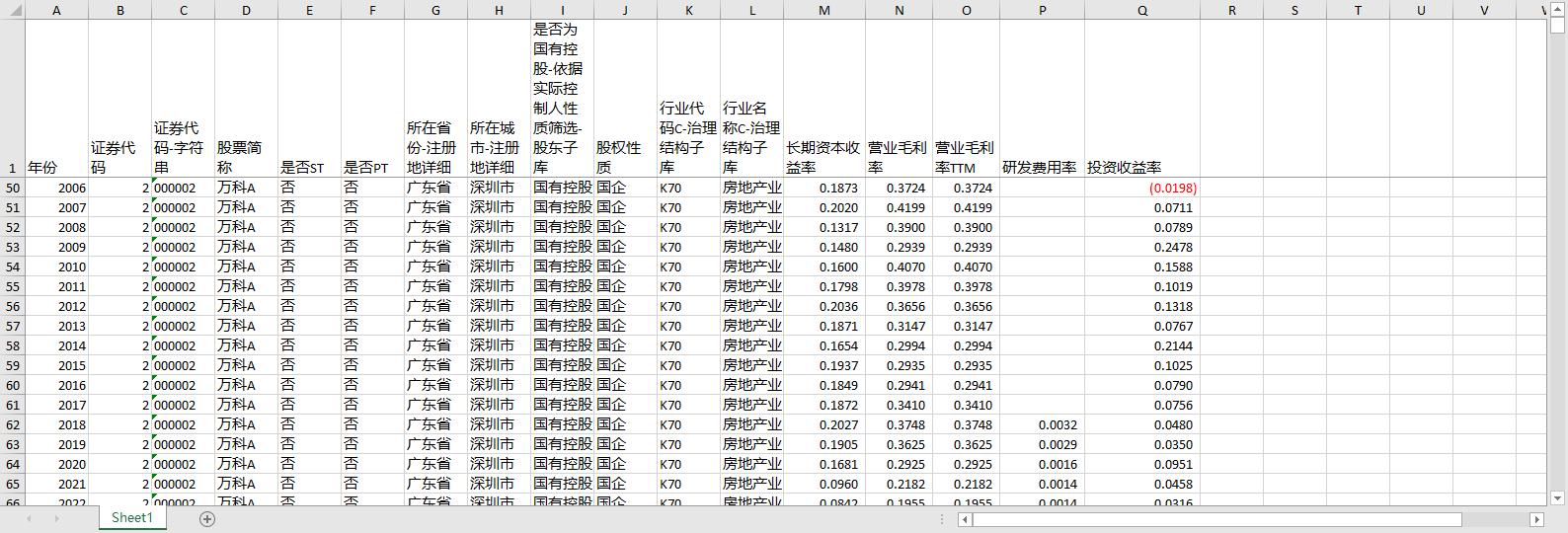 年份 证券代码 证券代码-字符串 股票简称 是否ST 是否PT 所在省份-注册地详细 所在城市-注册地详细 是否为国有控股-依据实际控制人性质筛选-股东子库 股权性质 行业代码C-治理结构子库 行业名称C-治理结构子库 长期资本收益率 营业毛利率 营业毛利率TTM 研发费用率 投资收益率