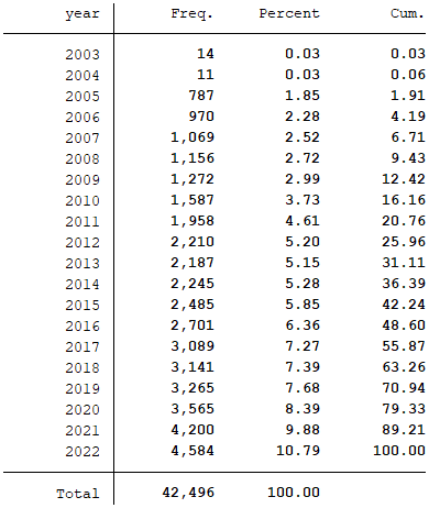 2.数据说明样本选择:全部A股2003-2022年数据(“第一大股东持股比例”数据是从2003年开始,所以数据起点选择为2003年)
