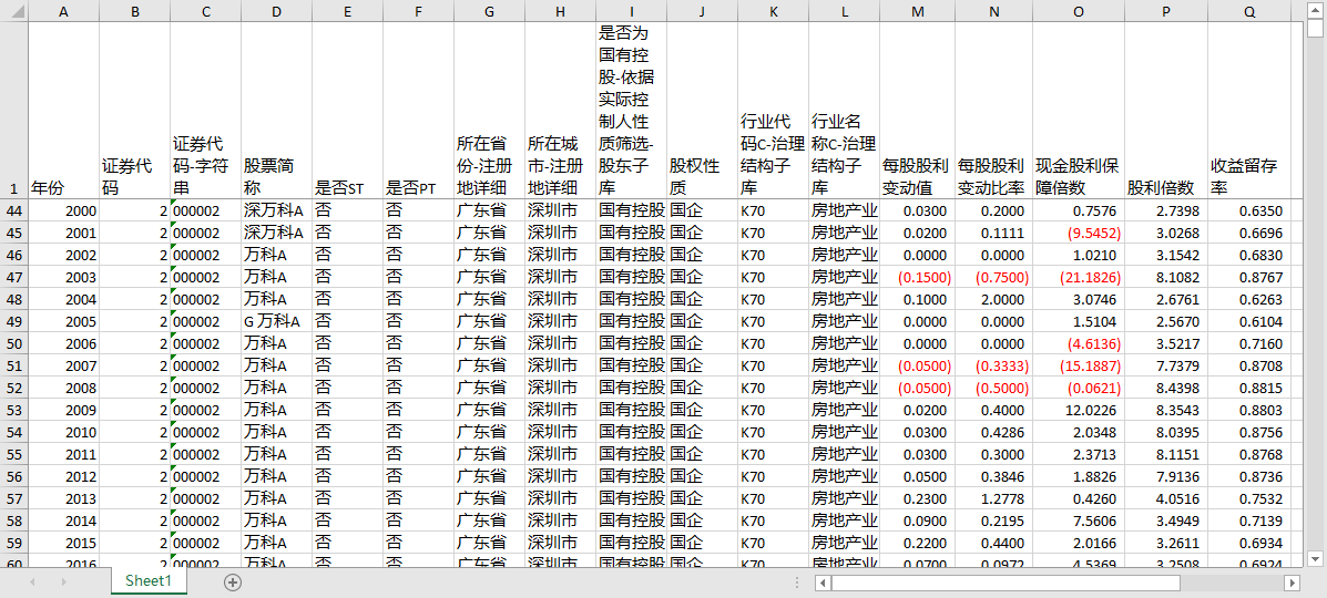 年份 证券代码 证券代码-字符串 股票简称 是否ST 是否PT 所在省份-注册地详细 所在城市-注册地详细 是否为国有控股-依据实际控制人性质筛选-股东子库 股权性质 行业代码C-治理结构子库 行业名称C-治理结构子库 每股股利变动值 每股股利变动比率 现金股利保障倍数 股利倍数 收益留存率