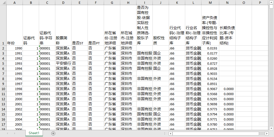 年份 证券代码 证券代码-字符串 股票简称 是否ST 是否PT 所在省份-注册地详细 所在城市-注册地详细 是否为国有控股-依据实际控制人性质筛选-股东子库 股权性质 行业代码C-治理结构子库 行业名称C-治理结构子库 资产负债率-[专题-操控性与非操控性应计利润子库] 长期负债比率-[专题-资本结构]