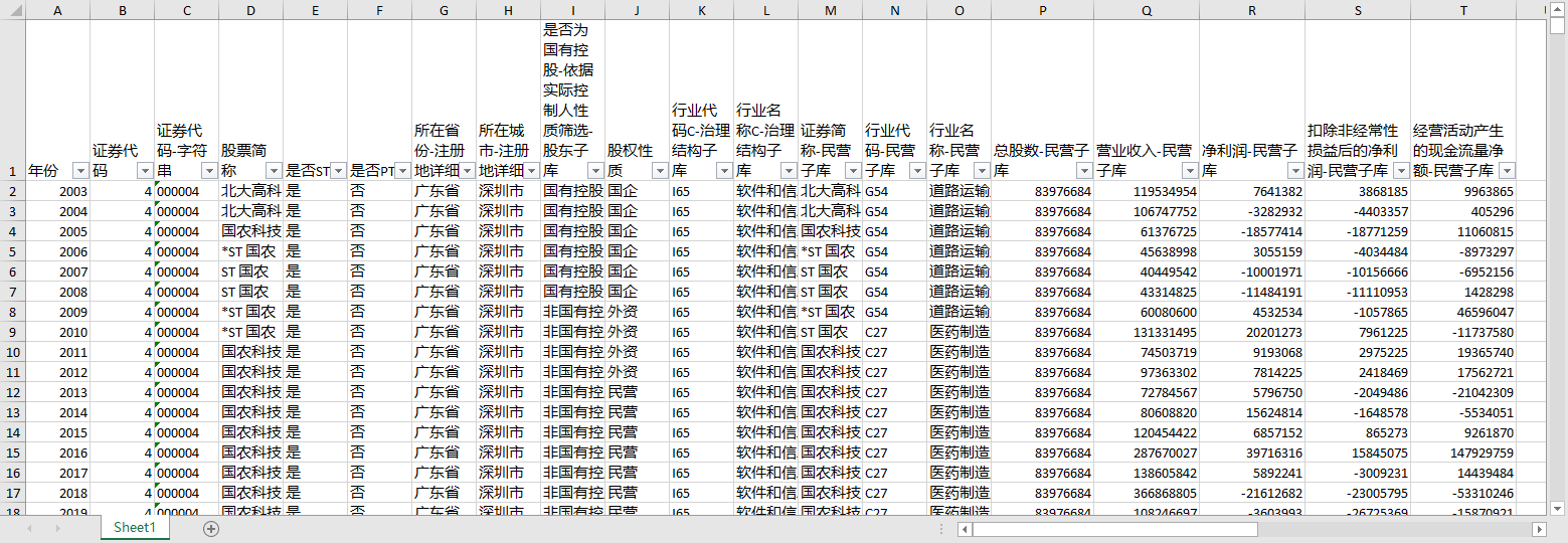 年份 证券代码 证券代码-字符串 股票简称 是否ST 是否PT 所在省份-注册地详细 所在城市-注册地详细 是否为国有控股-依据实际控制人性质筛选-股东子库 股权性质 行业代码C-治理结构子库 行业名称C-治理结构子库 证券简称-民营子库 行业代码-民营子库 行业名称-民营子库 总股数-民营子库 营业收入-民营子库 净利润-民营子库 扣除非经常性损益后的净利润-民营子库 经营活动产生的现金流量净额-民营子库