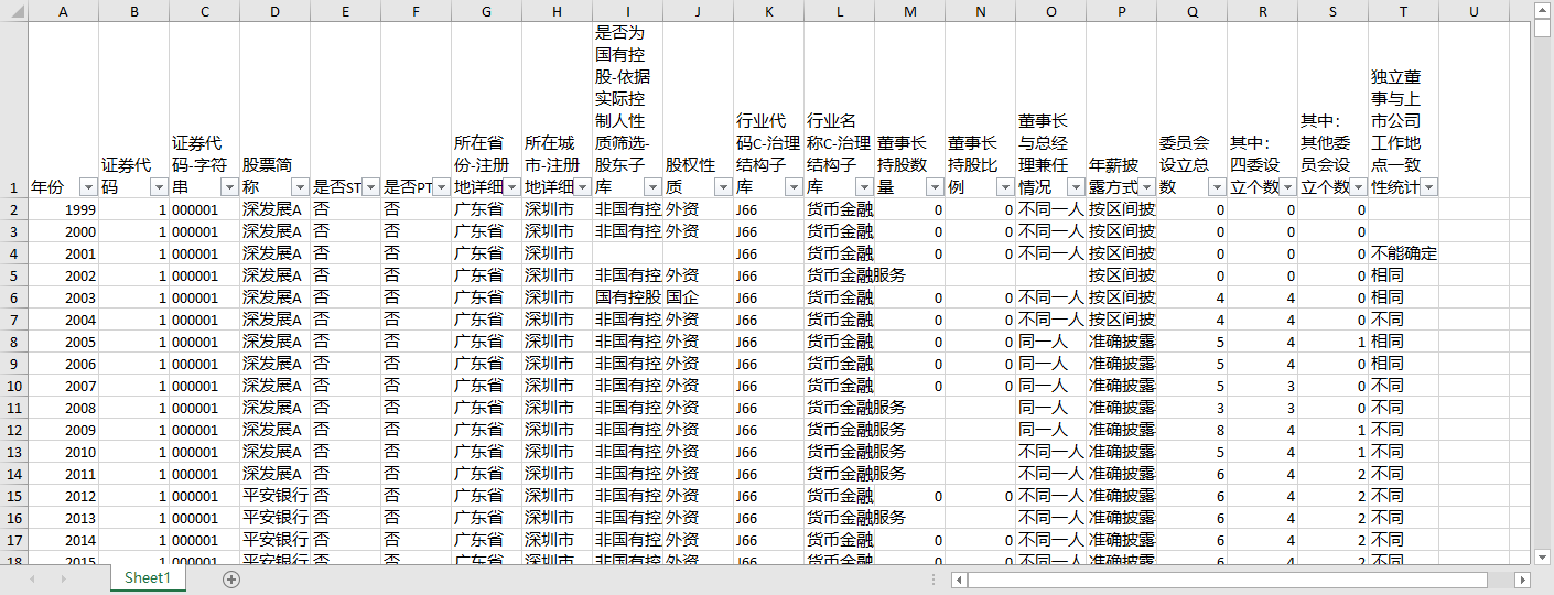 年份 证券代码 证券代码-字符串 股票简称 是否ST 是否PT 所在省份-注册地详细 所在城市-注册地详细 是否为国有控股-依据实际控制人性质筛选-股东子库 股权性质 行业代码C-治理结构子库 行业名称C-治理结构子库 董事长持股数量 董事长持股比例 董事长与总经理兼任情况 年薪披露方式 委员会设立总数 其中:四委设立个数 其中:其他委员会设立个数 独立董事与上市公司工作地点一致性统计