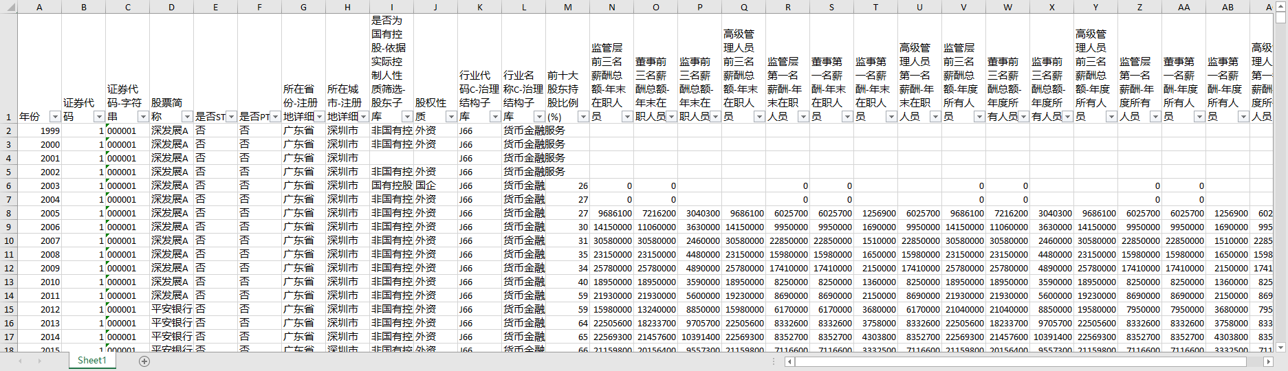 年份        证券代码        证券代码-字符串        股票简称        是否ST        是否PT        所在省份-注册地详细        所在城市-注册地详细        是否为国有控股-依据实际控制人性质筛选-股东子库        股权性质        行业代码C-治理结构子库        行业名称C-治理结构子库        前十大股东持股比例(%)        监管层前三名薪酬总额-年末在职人员        董事前三名薪酬总额-年末在职人员        监事前三名薪酬总额-年末在职人员        高级管理人员前三名薪酬总额-年末在职人员        监管层第一名薪酬-年末在职人员        董事第一名薪酬-年末在职人员        监事第一名薪酬-年末在职人员        高级管理人员第一名薪酬-年末在职人员        监管层前三名薪酬总额-年度所有人员        董事前三名薪酬总额-年度所有人员        监事前三名薪酬总额-年度所有人员        高级管理人员前三名薪酬总额-年度所有人员        监管层第一名薪酬-年度所有人员        董事第一名薪酬-年度所有人员        监事第一名薪酬-年度所有人员        高级管理人员第一名薪酬-年度所有人员