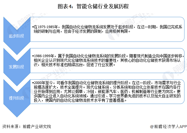 2000年至今,现代仓储系统、分拣系统和自动化立体库技术在国内各行业开始得到应用,尤其以烟草、冷链、新能源汽车、医药、机械制造等行业更为突出。更多国内企业进入自动化系统领域,通过引进、学习世界最先进的技术以及加大自主研发的投入,中国智能仓储行业技术水平有了显著提高。