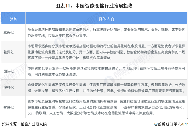 中国智能仓储行业发展趋势主要体现在龙头化、差异化、国际化、服务化和智慧化几个方面。