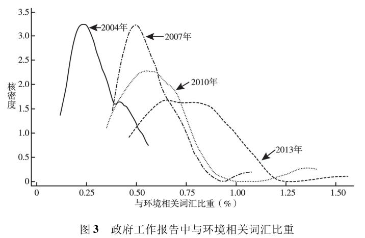 (三)政府治理、雾霾减排与经济发展质量:内生性及工具变量再讨论为进一步讨论政府环境治理对雾霾减排和经济发展质量的影响,我们需要构建合适的政府环境治理变量,并进行相应的模型设定以达到本文的分析目的。本文选取省级政府工作报告中与环境相关词汇出现频数及其比重作为地级市政府环境治理的代理变量。本文政府环境治理指标的具体构建步骤如下:首先,手工搜集31个省2004—2013年政府工作报告;其次,对政府工作报告文本进行分词处理;最后,统计与环境相关词汇出现的频次,并计算其占政府报告全文词频总数的比例。与环境相关词汇具体包括:环境保护、环保、污染、能耗、减排、排污、生态、绿色、低碳、空气、化学需氧量、二氧化硫、二氧化碳、PM10以及PM2.5等。图3绘制了政府工作报告中与环境相关词汇比重的核密度曲线图。