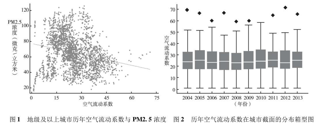 其中,VC、WS和BLH分别代表空气流动系数、风速与大气边界层高度。图1绘制了空气流动系数与PM2.5浓度的散点图及回归线,可以看出,空气流动系数与PM2.5浓度显著负相关。,使用空气流动系数还有两个有利的地方。第一,空气流动系数在截面和时间两个维度上均存在变化,尤其是城市的截面维度(图2),从而有助于在城市层面上识别空气流动系数对雾霾污染的影响。第二,也是这里需要特别强调的一点,即采用空气流动系数变量可以合理地控制雾霾污染的空间溢出效应,以准确识别政府环境治理对本地雾霾污染的影响。