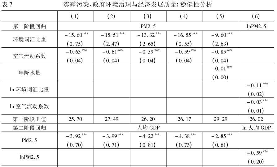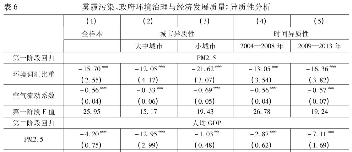 (一)工具变量回归结果本节选用能够控制雾霾污染空间溢出效应的空气流动系数以及能够全面度量地方政府环境政策和治理力度的政府环境治理指标作为减缓雾霾污染内生性的两个工具变量,在2SLS的统一框架内进一步地估计政府环境治理的减霾效果及其对经济发展质量的影响。表5报告了基于2SLS的工具变量回归结果。整体而言,表5第一阶段回归结果表明,无论选取何种度量指标,政府环境治理均在1%的显著性水平上降低了雾霾污染。一阶段F检验值远大于10这一经验取值,从而显著地排除了“弱工具变量”问题。第二阶段回归结果显示,雾霾污染对中国经济发展质量的影响在方向上和显著性上均与表2所报告的基准回归相似,进一步验证了雾霾污染对中国经济发展质量的负面效应。(二)异质性分析本小节接下来以表5第2列的设定为基准来探讨雾霾污染对经济发展质量的异质性影响。表6第二阶段回归结果报告了雾霾污染对经济发展质量的影响。不难发现,雾霾污染对大中城市经济发展质量的负面影响显著高于小城市,近年来雾霾污染的负面效应显著提升。这与前述传导机制分析结果相互佐证。
