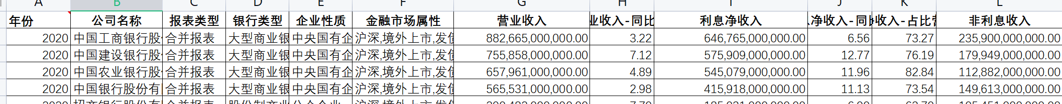 指标包括:年份 、 公司名称 、 报表类型 、 银行类型 、企业性质 、 金融市场属性 、 营业收入 、 营业收入-同比(%) 、利息净收入 、 利息净收入-同比(%) 、利息净收入-占比营收(%) 、 非利息收入 、 非利息收入-占比营收(%) 、 手续费及佣金净收入 、 手续费及佣金净收入-同比(%) 、 手续费及佣金净收入-占比营收(%) 、 投资净收益 、 投资净收益-占比营收(%) 、 拨备前利润 、拨备前利润-同比(%) 、 计提减值准备 、 资产减值损失 、 信用减值损失 、 其他资产减值损失 、计提拨备-占比营收(%) 、 利润总额 、利润总额-同比(%) 、 净利润 、 净利润-同比(%)、 归母净利润、 归母净利润-同比(%) 、 年化加权平均ROE(%) 、 年化平均ROA(%) 、净利差(%) 、 净利差-公布值(%)、 净息差(%) 、 净息差-公布值(%) 、 生息资产平均收益率(%) 、 计息负债平均成本率(%) 、成本收入比(%) 、 资产总计 资产总计-环比(%) 、资产总计-同比(%) 、贷款占比(%) 、贷款总额(不含应计利息) 、 贷款总额-环比(%) 、 贷款总额-同比(%) 、负债总计 、负债总计-环比(%) 、 负债总计-同比(%) 、 存款占比(%) 、存款总额(不含应计利息) 、 存款总额-环比(%) 、 存款总额-同比(%) 、 净资产 、归母净资产 、 生息资产、 生息资产平均余额 、生息资产平均余额-贷款占比(%) 等。