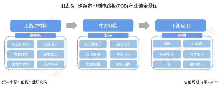 目前,印制电路板(PCB)产业链主要分为上游原材料,中游制造以及下游应用三个方面,珠海市目前已基本形成产业链,上游覆铜板代表企业有华正新材料、宏昌电子等,中游制造代表企业有方正、崇达电路等,下游应用范围广,包括通讯、计算机、汽车电子、消费电子等领域,具体产业链全景图如下: