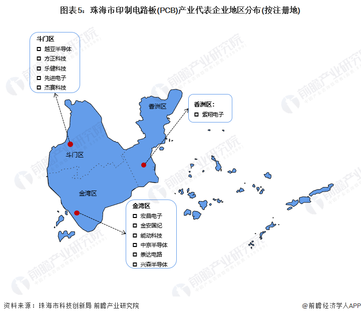 根据珠海市科技创新局公布的2022年珠海市创新百强企业名单,珠海市印制电路板(PCB)产业代表企业有宏昌电子、越亚半导体、方正科技、金安国纪、乐健科技、能动科技、紫翔电子等,具体的地区分布如下: