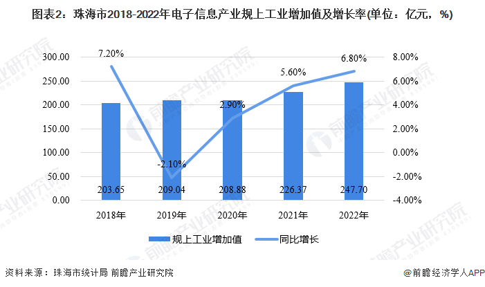 从电子信息产业的发展情况来看,根据珠海市统计局官网的数据,2018年电子信息产业累计规上工业增加值203.65亿元,同比增长7.2%;2019年累计完成209.04亿元,同比下降2.1%;2020年累计完成208.88亿元,同比增长2.9%;2021年累计完成226.37亿元,同比增长5.6%;2022年累计完成247.70亿元,同比增长6.8%。可见珠海市电子信息产业近年来保持较好发展势头。(注:因印制电路板产业相关数据缺失,故以电子信息产业估计印制电路板产业的发展情况)