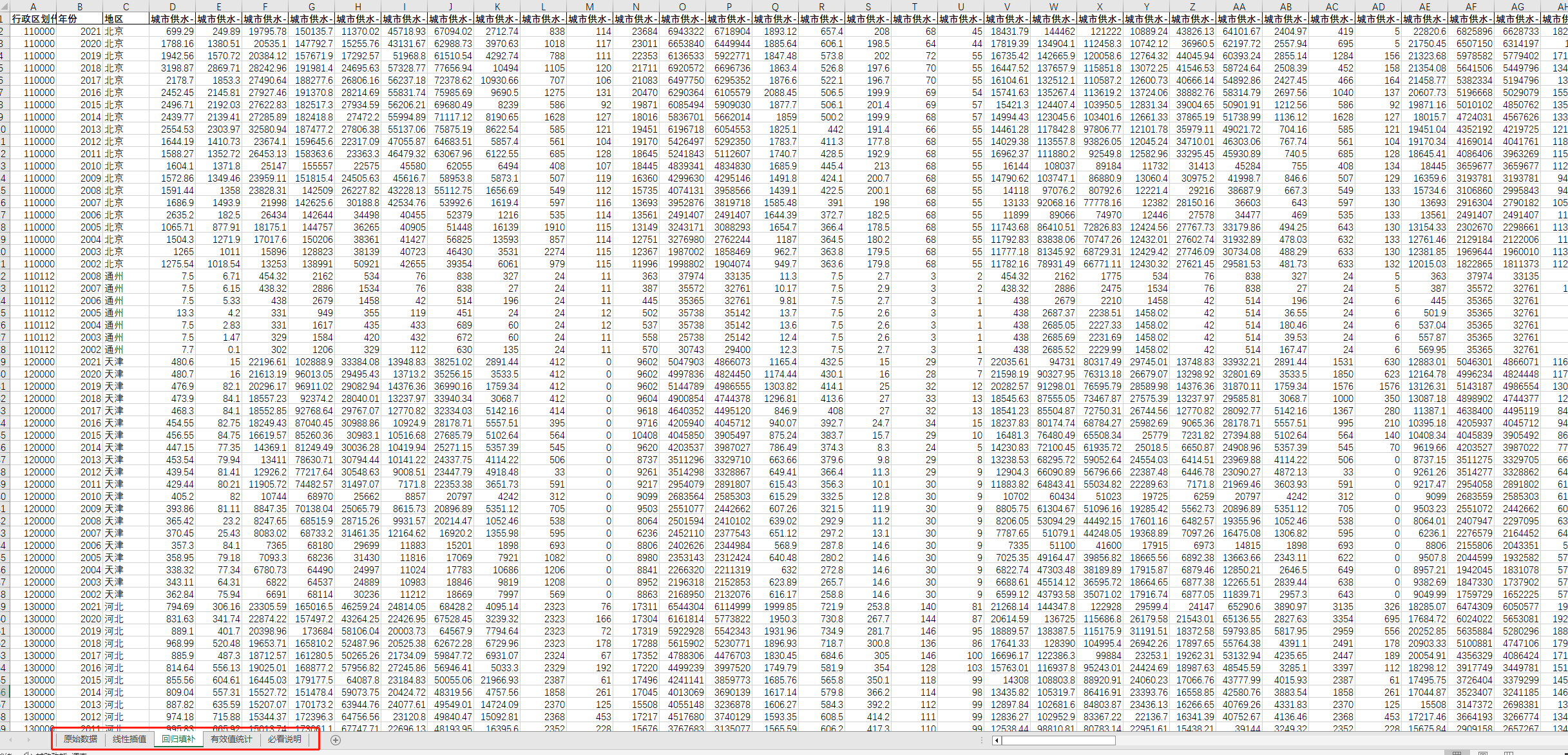 中国城乡建设数据库(包含四个页签:原始数据、线性插值、ARIMA填补、有效统计值四个页签)