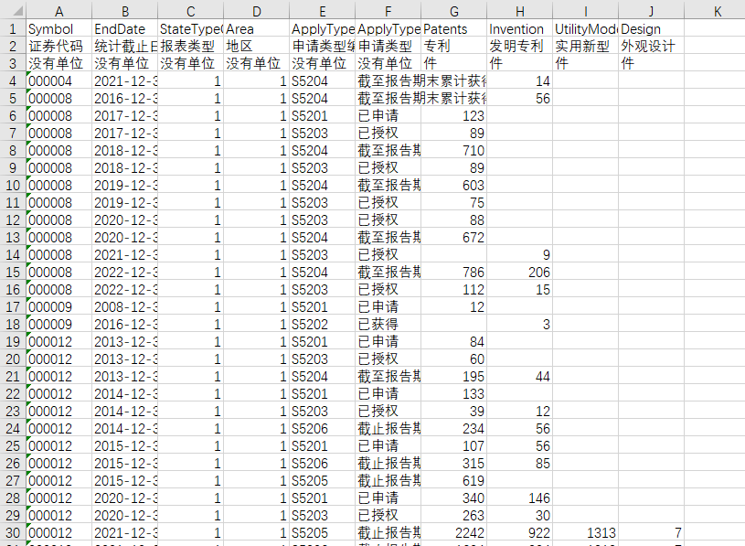 ApplyTypeCode [申请类型编码] - S5201=已申请;S5202=已获得;S5203=已授权;S5204=截至报告期末累计获得;S5205=截止报告期末累计已被受理;S5206=截止报告期末累计已授权