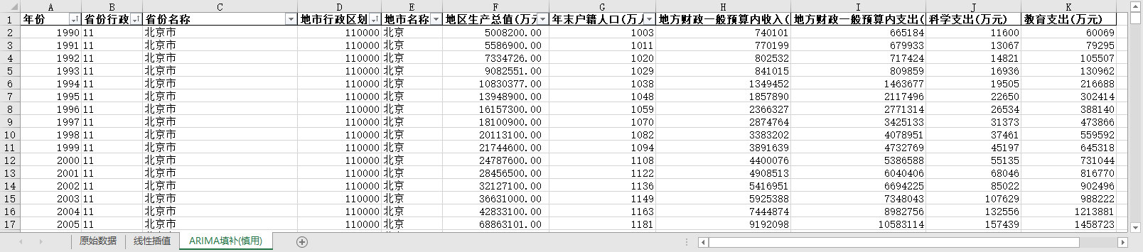 excel数据文件包原始数据(由于多年度指标不同存在缺失值)、线性插值、ARIMA填补三个版本,提供您参考使用。