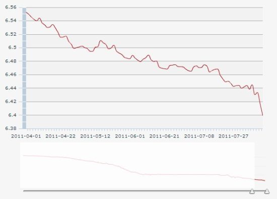 2011年8月11日银行间外汇市场人民币汇率中间价为:1美元对人民币6.3991元,1欧元对人民币9.0720元,100日元对人民币8.3132元,1港元对人民币0.81939元, 1英镑对人民币10.3313元,人民币1元对0.46950林吉特,人民币1元对4.6067俄罗斯卢布。