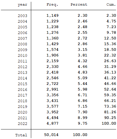 样本选择:全部A股2003-2022年数据(“Herfindahl_5”在数据库中是从2003年开始,所以数据起点选择为2003年)