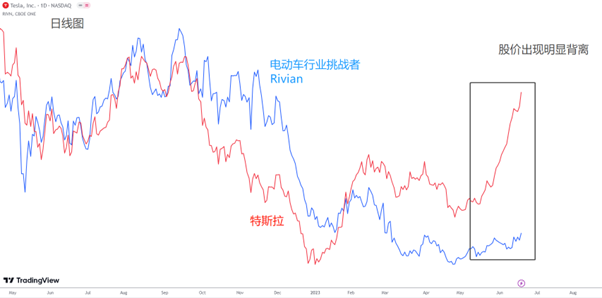 然而事实上,这波大涨和电动车行业关联不大。从消息面来看,特斯拉的充电标准以及电动皮卡的利好消息的确为板块提供支撑。然而从股价表现来看,特斯拉股价暴涨,突破且远超2月份高点。这种表现放在整个电动车上下游行业中都极为罕见。由图可见,对比电动皮卡挑战者Rivian,特斯拉的股价出现明显的背离现象。不仅是电动车厂、电池生产商、充电桩、甚至是锂矿股都没有如此夸张的表现。因此特斯拉的股价暴涨不能简单地用“电动车板块崛起”来解释。
