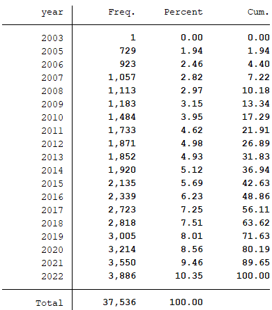 样本选择:全部A股2003-2022年数据(初始数据在数据库中是从1999年开始,经过处理后的数据起点为2003年)